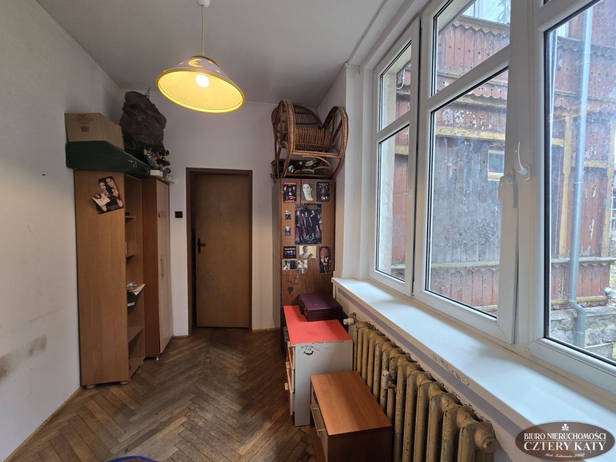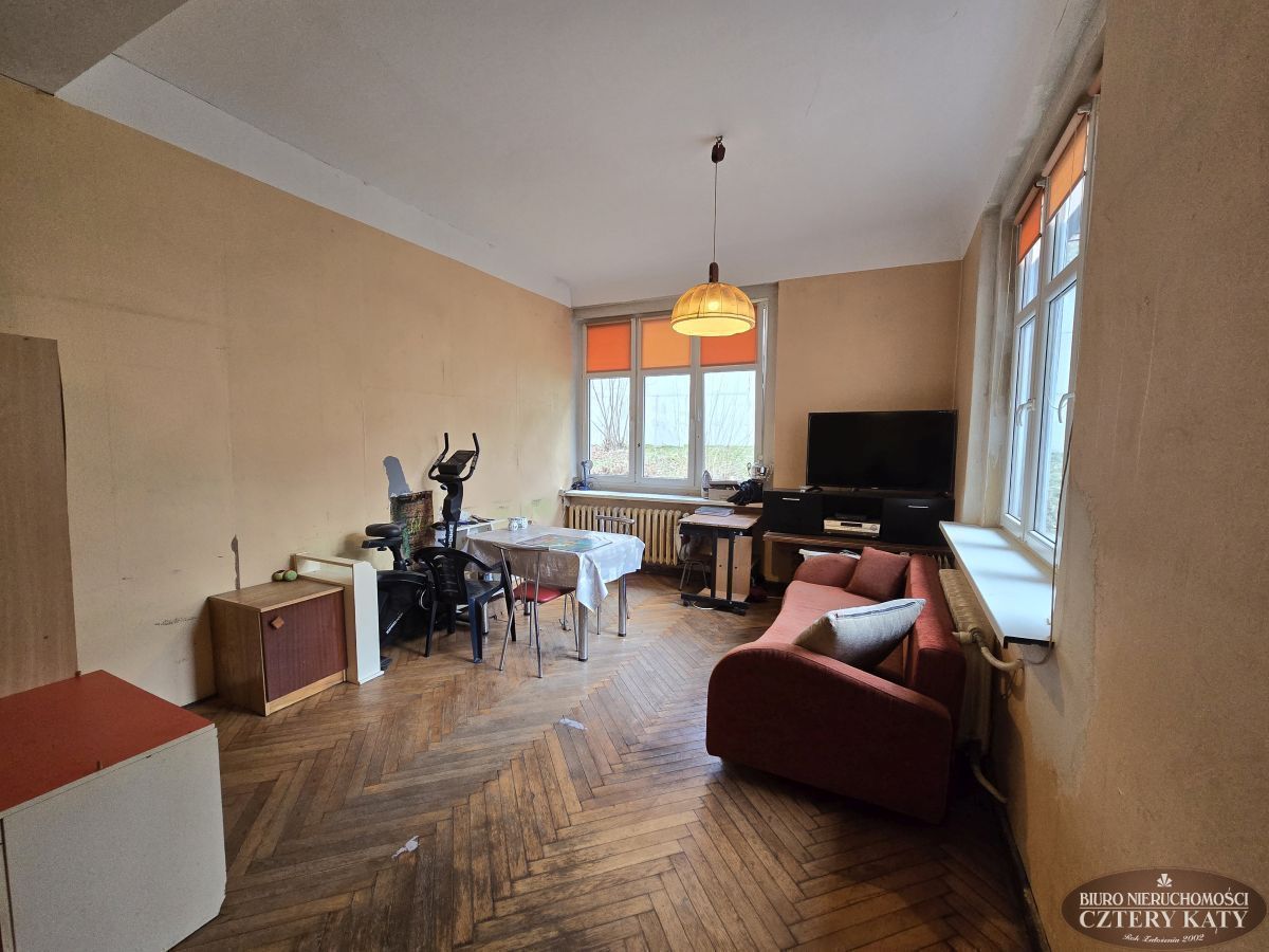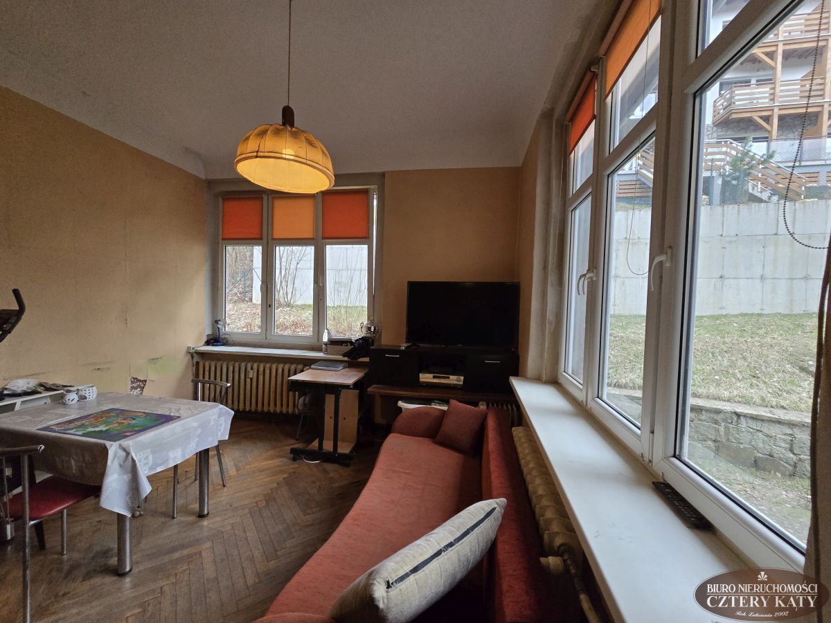Biuro Nieruchomości Cztery Kąty prezentuje duże mieszkanie położone w centrum miasta Karpacz. Lokal położony na wysokim parterze budynku i składa się z: 2 pokoi, kuchni, łazienki z wc, przedpokoju, werandy ( która obecnie jest pokojem), oraz pomieszczenia gospodarczego o łącznej powierzchni 90,70m2. Do mieszkania przynależy dodatkowo w.c. na półpiętrze oraz piwnica. Łączna powierzchnia lokalu to 95,40m2. Lokal jest do remontu. Duża otwarta przestrzeń daje duże możliwości do nowej aranżacji. Mieszkanie można podzielić na dwa mniejsze z osobnymi wejściami do lokali bez straty powierzchni na dodatkowe przedpokoje.